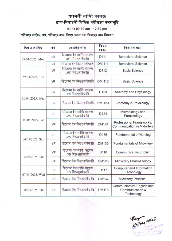প্রতিষ্ঠান ভিত্তিক ১ম মাইগ্রেশনের সুযোগ প্রাপ্তদের তালিকা ২য় মাইগ্রেশনের আবেদন সংক্রান্ত (২০২৫-২৬ শিক্ষাবর্ষ) কারিকুলাম ও পরীক্ষা পদ্ধতি অরিয়েন্টেশন লাইসেন্স পরীক্ষায় উত্তীর্ণদের রেজিস্ট্রেশনের আবেদন সংক্রান্ত ডিপ্লোমা কোর্সের ৩য় বর্ষের ফলাফল প্রকাশ নার্সিং ও মিডওয়াইফারি কোর্সসমূহে ২০২৫-২৬ শিক্ষাবর্ষে বেসরকারি প্রতিষ্ঠানে ৫ % আসনে মেধাবী-অসচ্ছল কোটায় ভর্তির আবেদন সংক্রান্ত লাইসেন্সিং পরীক্ষার ফলাফল (মার্চ ২০২৬) লাইসেন্সিং পরীক্ষা মার্চ ২০২৬ সংক্রন্ত নির্দেশনা ”পবিত্র শব-ই-কদর, জুমাতুল বিদা, পবিত্র ঈদুল ফিতর ও স্বাধীনতা দিবস” উপলক্ষ্যে ছুটির নোটিশ নার্সিং ও মিডওয়াইফারি কলেজ/ইনস্টিটিউটের ক্লাস ও পরীক্ষা বন্ধ সংক্রান্ত লাইসেন্সিং পরীক্ষা মার্চ ২০২৬ এর প্রবেশপত্র প্রিন্ট সংক্রন্ত লাইসেন্সিং পরীক্ষায় পেশেন্ট কেয়ার টেকনোলজি কোর্সের আবেদনকৃতদের কাগজপত্র ঘাটতি সংক্রান্ত নার্সিং ও মিডওয়াইফারি কোর্সসমূহে ২০২৫-২৬ শিক্ষাবর্ষে ভর্তির নির্দেশনা ২০২৫-২৬ শিক্ষাবর্ষে ভর্তির ফলাফল দেখার লিংক ২০২৫-২৬ শিক্ষাবর্ষে নার্সিং ও মিডওয়াইফারি কোর্সে সরকারি প্রতিষ্ঠানে ভর্তির ফলাফল ”আন্তর্জাতিক মাতৃভাষা দিবস” ২০২৬ উপলক্ষ্যে ছুটির নোটিশ Midterm Supplementary Examination Routine February/2026 ত্রয়োদশ জাতীয় সংসদ নির্বাচন ও গণভোট-২০২৬ উপলক্ষে ছুটির নোটিশ লাইসেন্স পরীক্ষার ফরমপূরণ সংক্রান্ত পবিত্র শবে বরাত উপলক্ষে ছুটির বিজ্ঞপ্তি কারিকুলাম ও পরীক্ষা পদ্ধতি অরিয়েন্টেশন (ব্যাচ-২) কারিকুলাম ও পরীক্ষা পদ্ধতি অরিয়েন্টেশন (ব্যাচ-১) লাইসেন্স পরীক্ষার ফরমপূরণ সংক্রান্ত ডিপ্লোমা কোর্সের ১ম বর্ষ, এবং বিএসসি কোর্সের ১ম, ২য় ও ৩য় বর্ষ জানুয়ারী/২০২৬ লিখিত পরীক্ষা সময়সূচী ২০২৫-২০২৬ শিক্ষাবর্ষে নার্সিং ও মিডওয়াইফারি কোর্সে ভর্তির আবেদনের নির্দেশনা ডিপ্লোমা কোর্সের ১ম, ২য় ও ৩য় বর্ষ উত্তরপত্র জমাদান সংক্রান্ত ২০২৫-২০২৬ শিক্ষাবর্ষে নার্সিং ও মিডওয়াইফারি কোর্সে ভর্তি বিজ্ঞপ্তি ডিপ্লোমা কোর্সের ১ম, ২য় ও ৩য় বর্ষ ব্যবহারিক ও মৌখিক পরীক্ষা গ্রহণ সংক্রান্ত ”যিশু খ্রিস্টের জন্মদিন (বড়দিন) এবং শীতকালীন অবকাশ” উপলক্ষ্যে ছুটির নোটিশ। ১৬ ডিসেম্বর (মহান বিজয় দিবস) উদযাপন উপলক্ষ্যে নোটিশ । ডিপ্লোমা কোর্সের ১ম, ২য় ও ৩য় বর্ষ চুড়ান্ত পরীক্ষার রুটিন কম্প্রিহেনসিভ পরীক্ষায় উত্তীর্ণদের রেজিস্ট্রেশন সংক্রান্ত কম্প্রিহেনসিভ-লাইসেন্সিং পরীক্ষার ফলাফল ডিপ্লোমা কোর্সের ১ম, ২য় ও ৩য় বর্ষ চূড়ান্ত পরীক্ষার ফরম পূরন সংক্রান্ত জরুরি সতর্কীকরণ নোটিশ ভুয়া বিজ্ঞপ্তি সংক্রান্ত সতর্কতা নির্বাচনী লিখিত পরীক্ষার সময়সূচি, সেপ্টেম্বর-২০২৫। ২০২৪-২৫ শিক্ষাবর্ষে ভর্তিকৃত